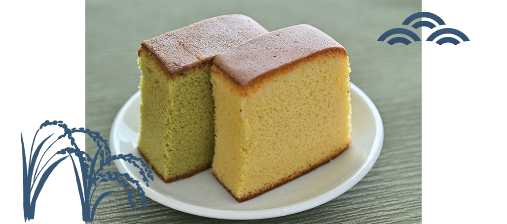 宮若市の米農家が、丹精込めて減農薬減化学肥料栽塔で育てた自家製米を米粉にし、カステラの生地として使いました。